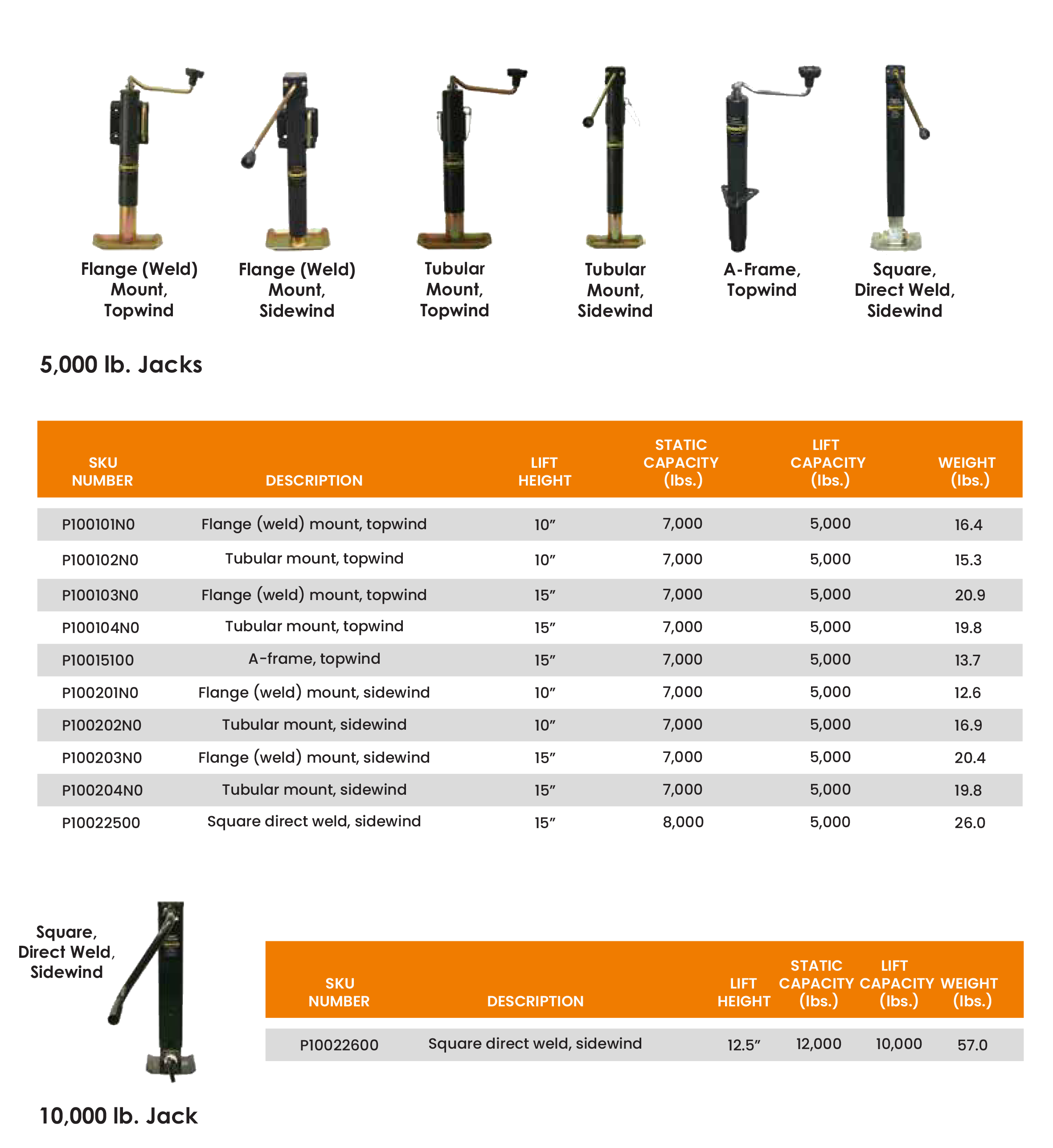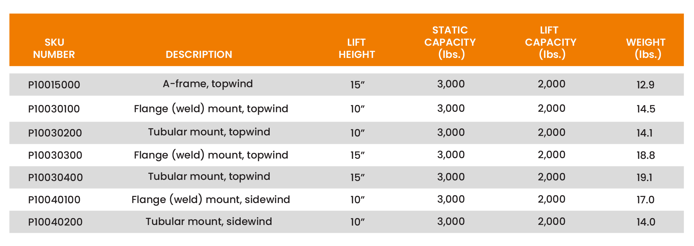 rugged foot plate.Available in several topwind and sidewind styles with lift heights of 10″, 12.5″